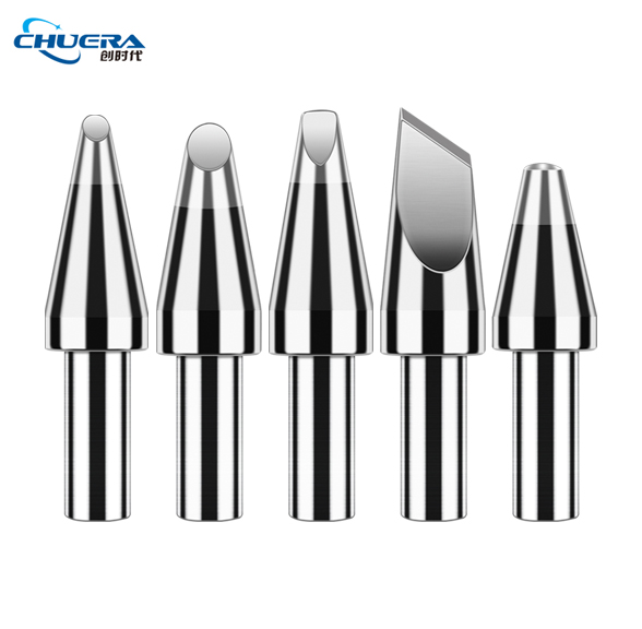 B型(圓錐形):B型烙鐵頭無方向性,整個烙鐵頭前端均可進行焊接。LB型是B型的一種,形狀修長。能在焊點周圍有較高身之元件或焊接空間狹窄的焊接環(huán)境中靈活操作。應(yīng)用范圍:適合一般焊接,無論大小之焊點,也可使用B型烙鐵頭。